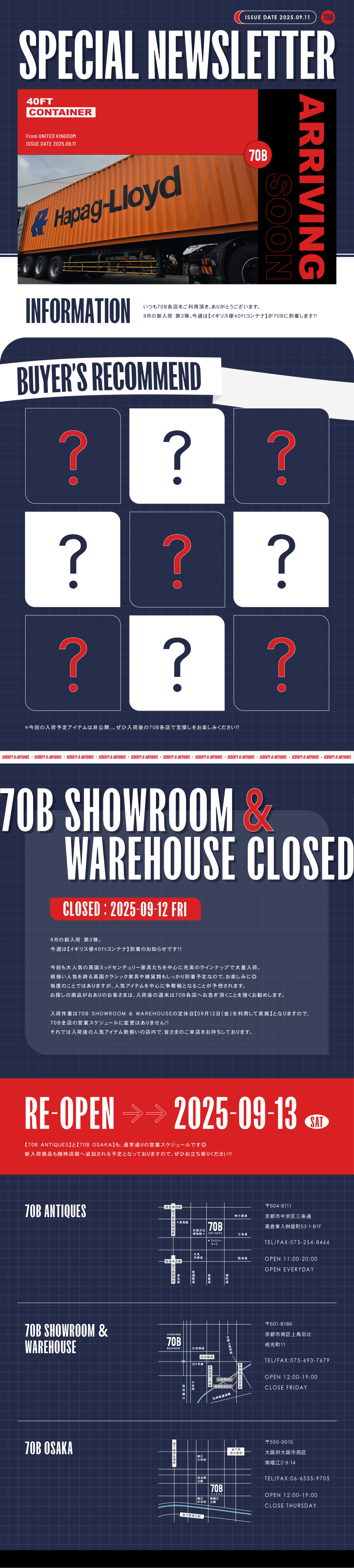 お探しの商品がおありのお客様は、入荷直後の70B各店へお急ぎ頂くことを強くお勧めします。