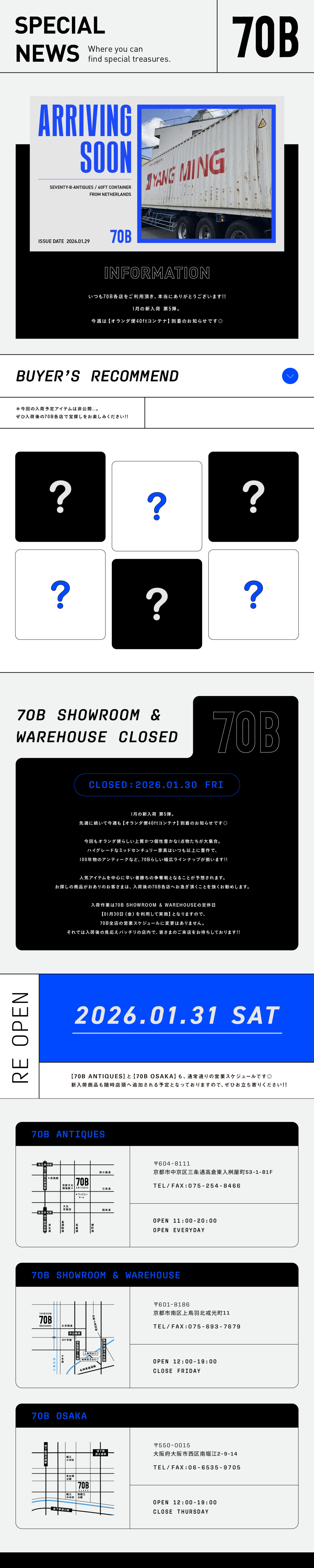 お探しの商品がおありのお客様は、入荷直後の70B各店へお急ぎ頂くことを強くお勧めします。